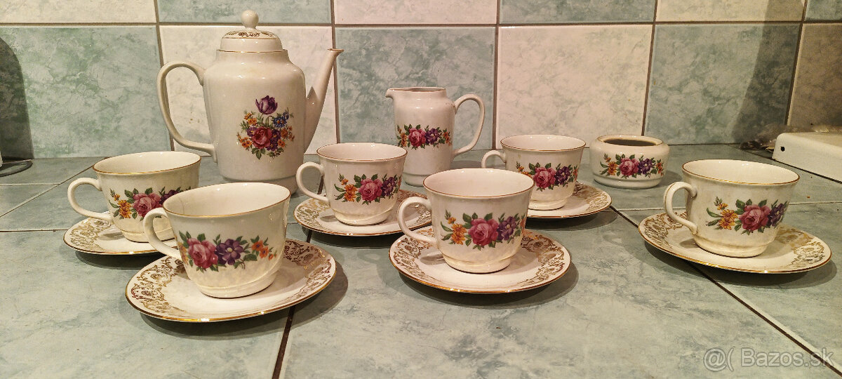 porcelánová čajová (kávová) súprava - [22.2. 2026]made in Czechoslovakia, set obsahuje: čajník, mliečnik, cukornička, 6x šálky + 6x podšálky.na jednom tanieriku mierne poškodenie, viď obrázok.