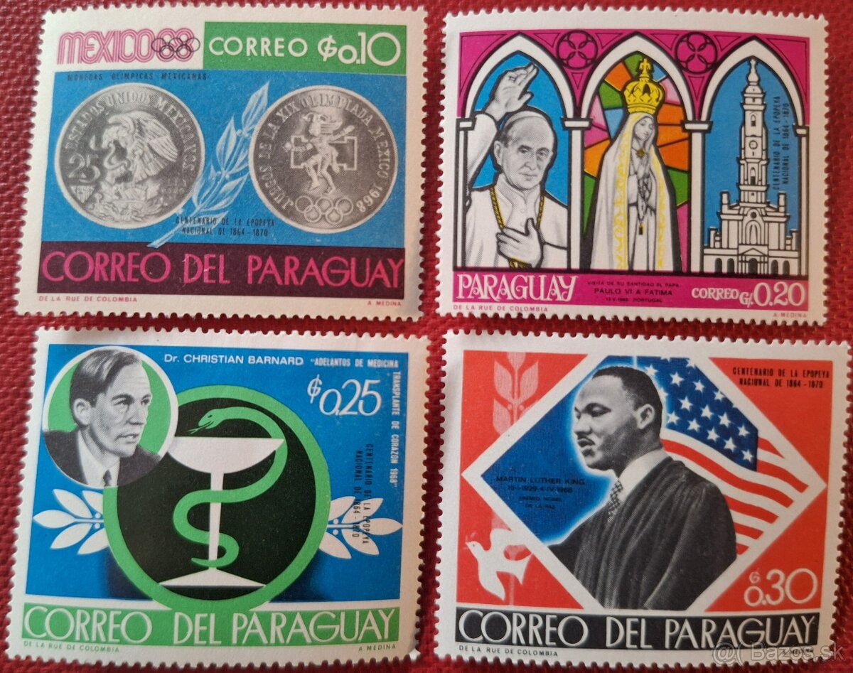 Čisté, neopečiatkované známky *Paraguaj, séria 4 známok, Events in 1968, 1968, vynikajúci stav suma 0,50 € platba na účet alebo dobierkou. V prípade záujmu mi pošlite vypísanú krajinu, ktorá známku vydala a číslo inzerátu. Poštovné podľa tarify. Pri rýchlej kúpe možná zľava, alebo poštovné zdarma. Pozri aj ďalšie moje ponuky. V prípade záujmu zašlem na požiadanie ďalšie foto viac ako 6000 známok na predaj.