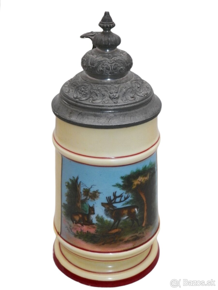 Starožitná porcelánová holba s průsvitkou zdobená mysliveckým motivem, cínové odstupňované víčko, cejchovaná 1/2 L, výška 22 cm, kvalitní zabalení je samozřejmostí, dobírka Packeta 5,-€.