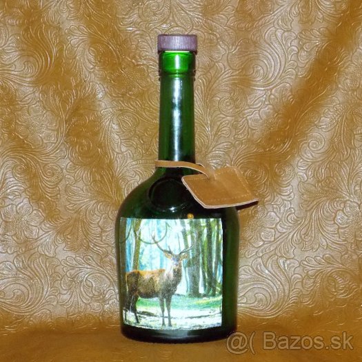 Predám ozdobnú atypickú fľašu vhodnú ako darček pre poľovníka. Pôvodný zelený sklenený materiál je dotvorený technikou decoupage s motívom jeleňa medzi stromami. Na hnedú koženú visačku priviazanú na hrdle koženou stužkou je možné dopísať meno obdarovaného, čistá plocha na zadnej strane je pripravená na napísanie želania. Výnimočná nízka fľaša s motívom lakovaným transparentným lakom, umývateľná vlhkou utierkou, je dodávaná s pôvodnou hnedou korkovo-drevenou zátkou.