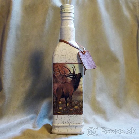 Predám ozdobnú darčekovú atypickú fľašu vhodnú na poľovnícky stôl. Krémový akrylový podklad s krakelovým efektom je dotvorený technikou decoupage s motívmi lovnej zveri. Fľaša lakovaná transparentným lakom je zdobená zo všetkých štyroch strán, na hrdle je visačka z hnedej kože, na ktorú je možné dopísať meno obdarovaného.