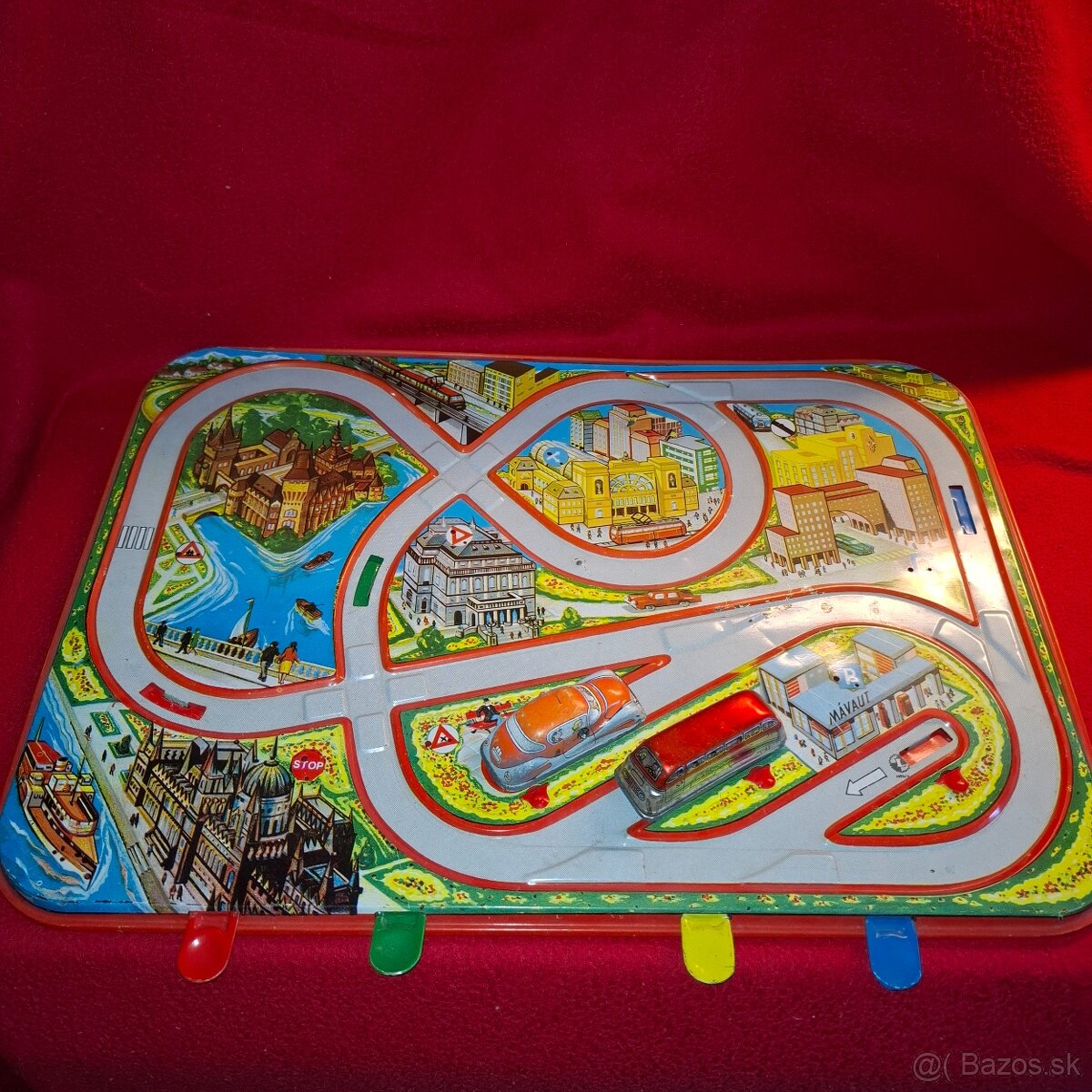 Auticka PREDANE. Predam plechovu autodrahu v krasnom, nehranom stave + auto a autobus. Viac foto a info mailom