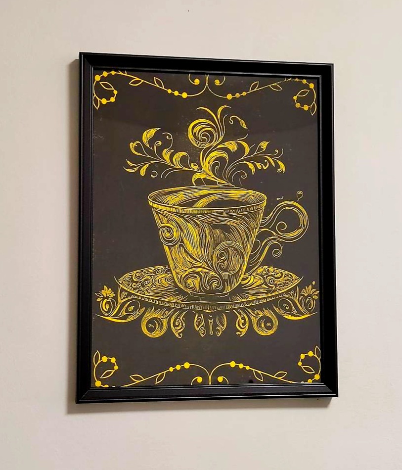 Predám autorský obraz vytvorený technikou linorytu, tlačený na kvalitný papier Fabriano 220 gms vo formáte **A3**. Motív elegantnej šálky a dekoratívnymi detailmi pôsobí útulne a je ideálny ako doplnok do kuchyne, kaviarne či ako štýlový darček.