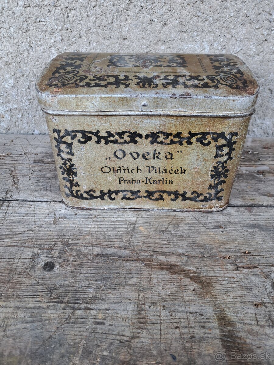 Predám starú veľkú plechovku s napisom Oveka, oldrich vitaček, Praha- Karlin. Cena 15e plus poštovné