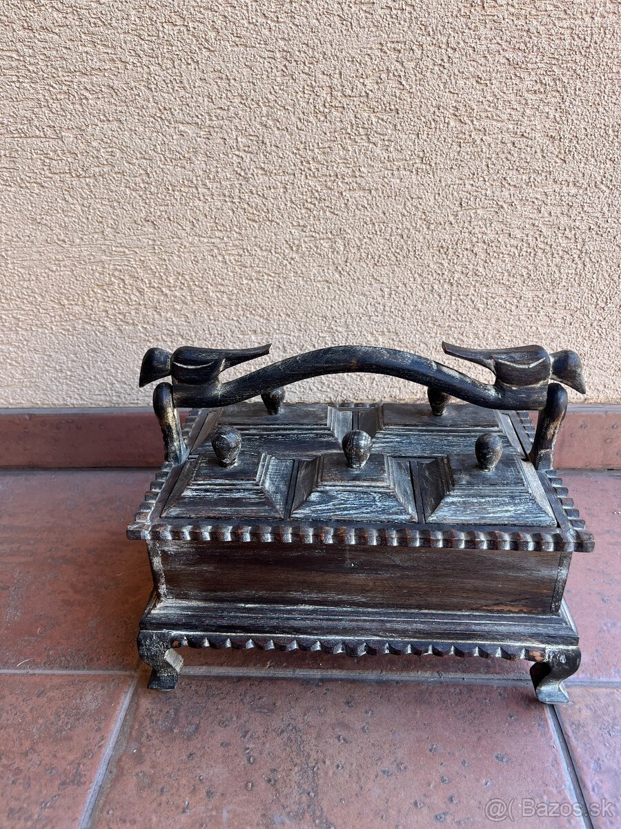 Ručne vyrezávaná drevená dózička na koreniny z ázijského dreva.Začiatok 20. storočia.