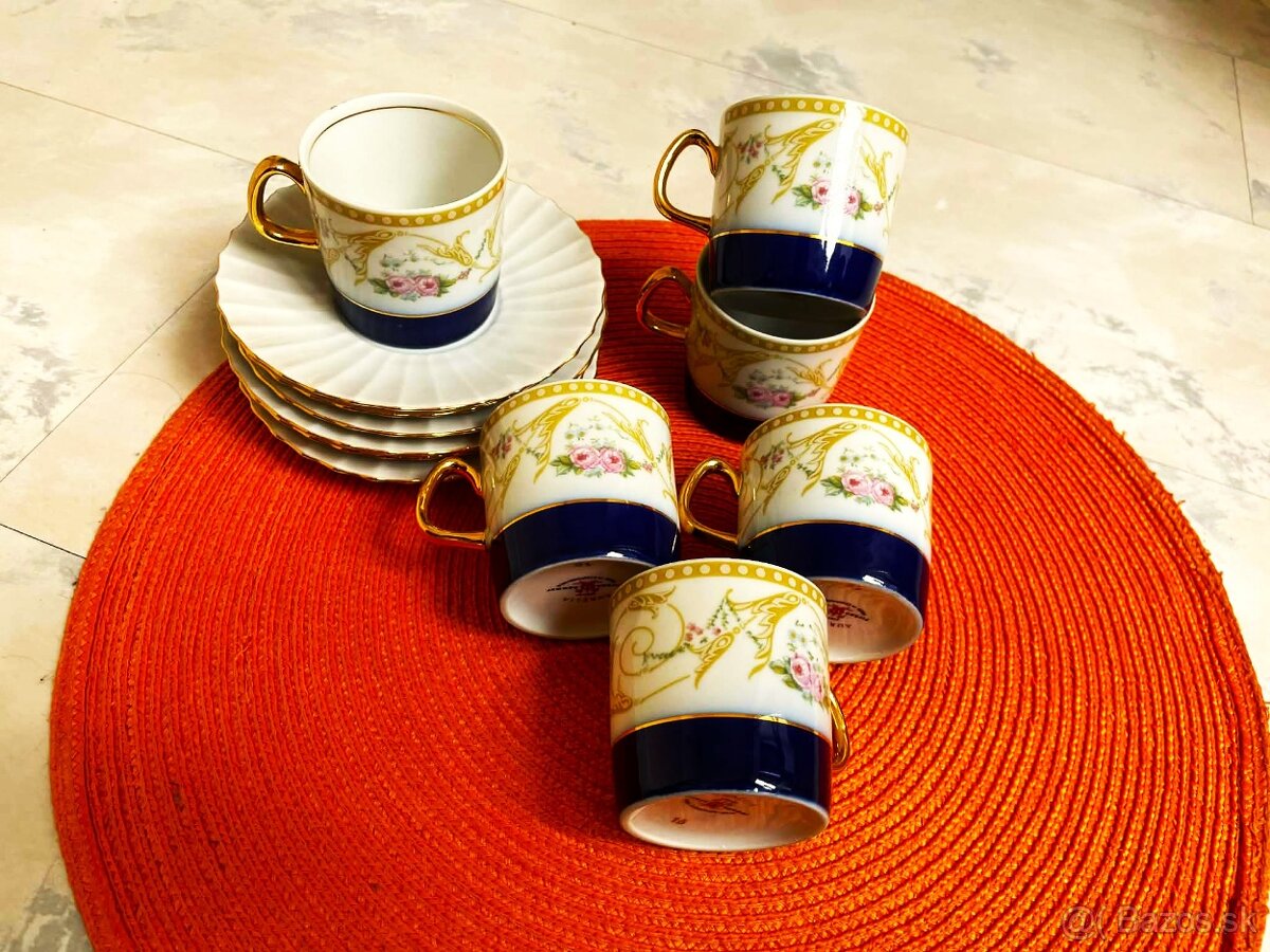 15 ks starožitného retro kávového setu,označovaného ako "mocca servis", od značky Aurelia ateliér Pirken Hammer (tiež Pirkenhammer) z Československa,kupovanú v bývalom Tuzexe,z kvalitného porcelánu,je vo vitrínovom stave,Tento konkrétny dizajn šálok a podšálok bol vytvorený dizajnérom Jaroslavom Ježkom v 60. rokoch,kvalitný glazovaný porcelán,set má kvetinový vzor, výrazný tmavomodrý spodný okraj a zlaté lemy a uško.