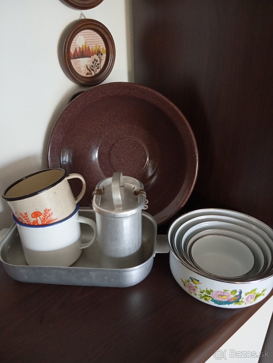 vajling 29 cm, 1.50€, obedár 2€, hrnčeky 2x1€, plech 1.50€, sada plechových misiek 5ks 2€, zapekacia misa 2€, odšťavovač citrusov 0.50€,
