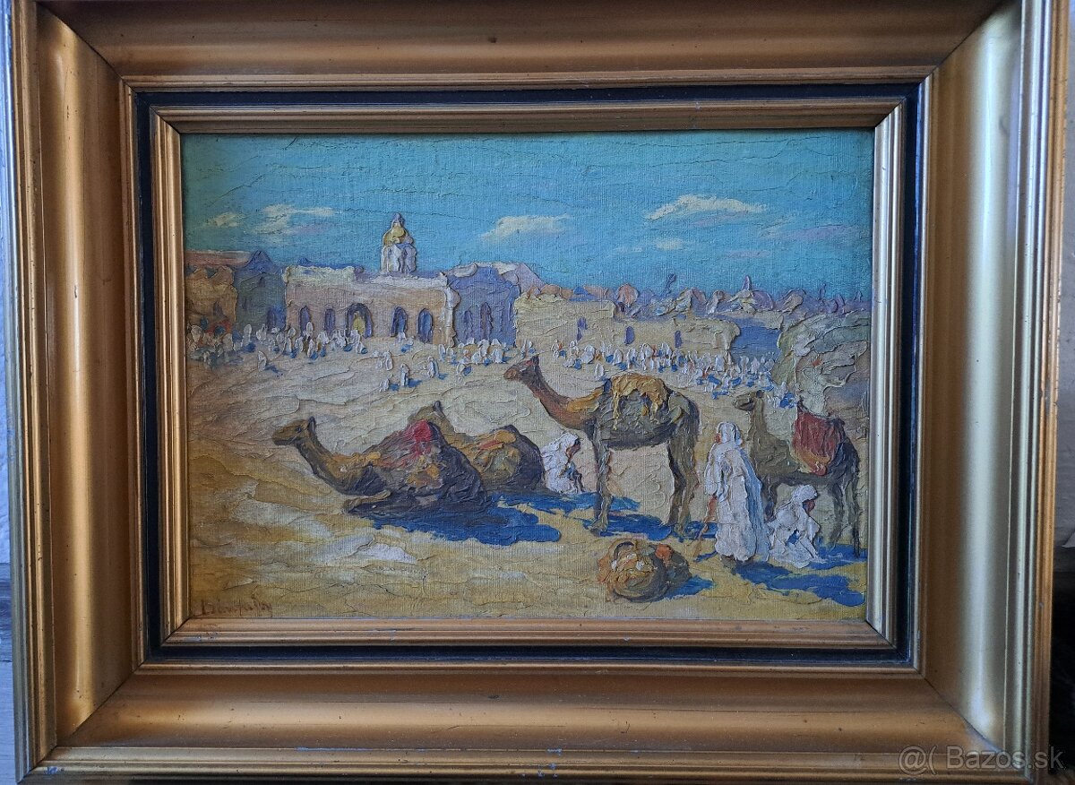 Predám obraz Karavána , olej na sololite, rozmer s rámom 48cm x 38cm , signovaný, prelom storočia19/20.