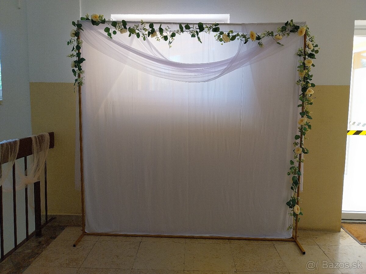 Predám fotostenu vo veľkosti 2x2m vhodnu na svadobné fotenie. Cena kovovej konštrukcie zlatej farby s umelými kvetmi a bielou zástenou spolu 80€.