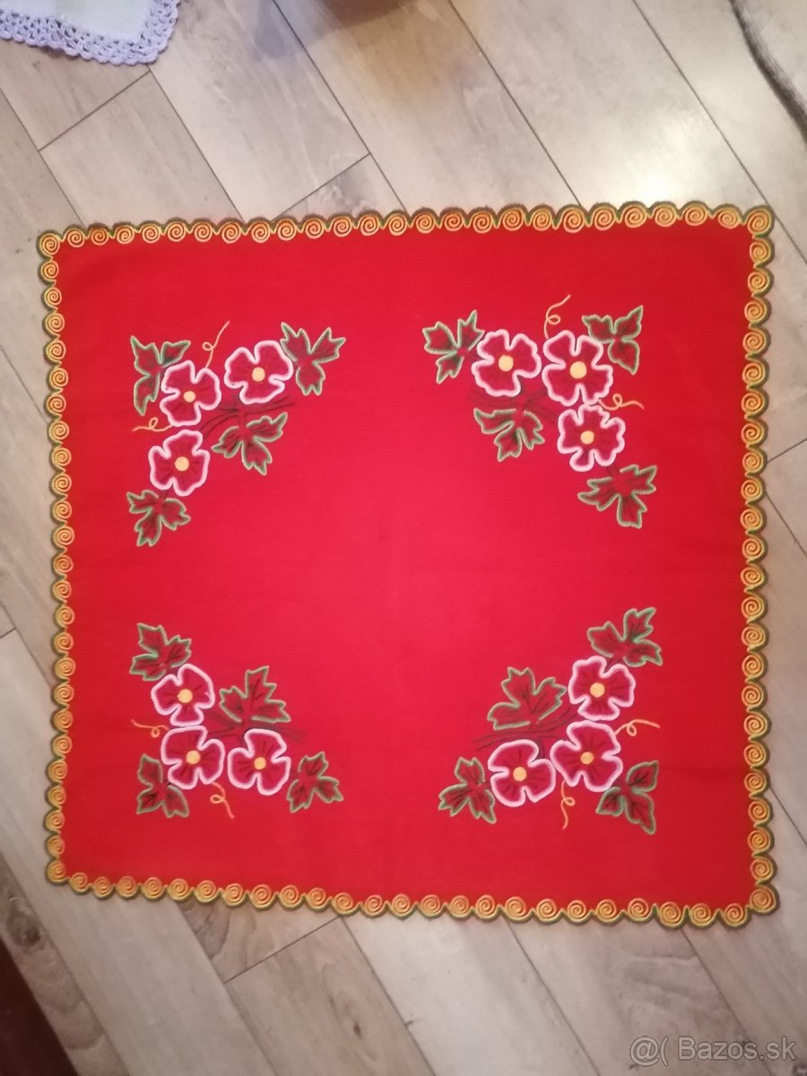 Predám obrus ručne vyšívaný krivou ihlou... Červený s olemovanim a farebnou výšivkou. Rozmer 60x60...nepoužívaný...