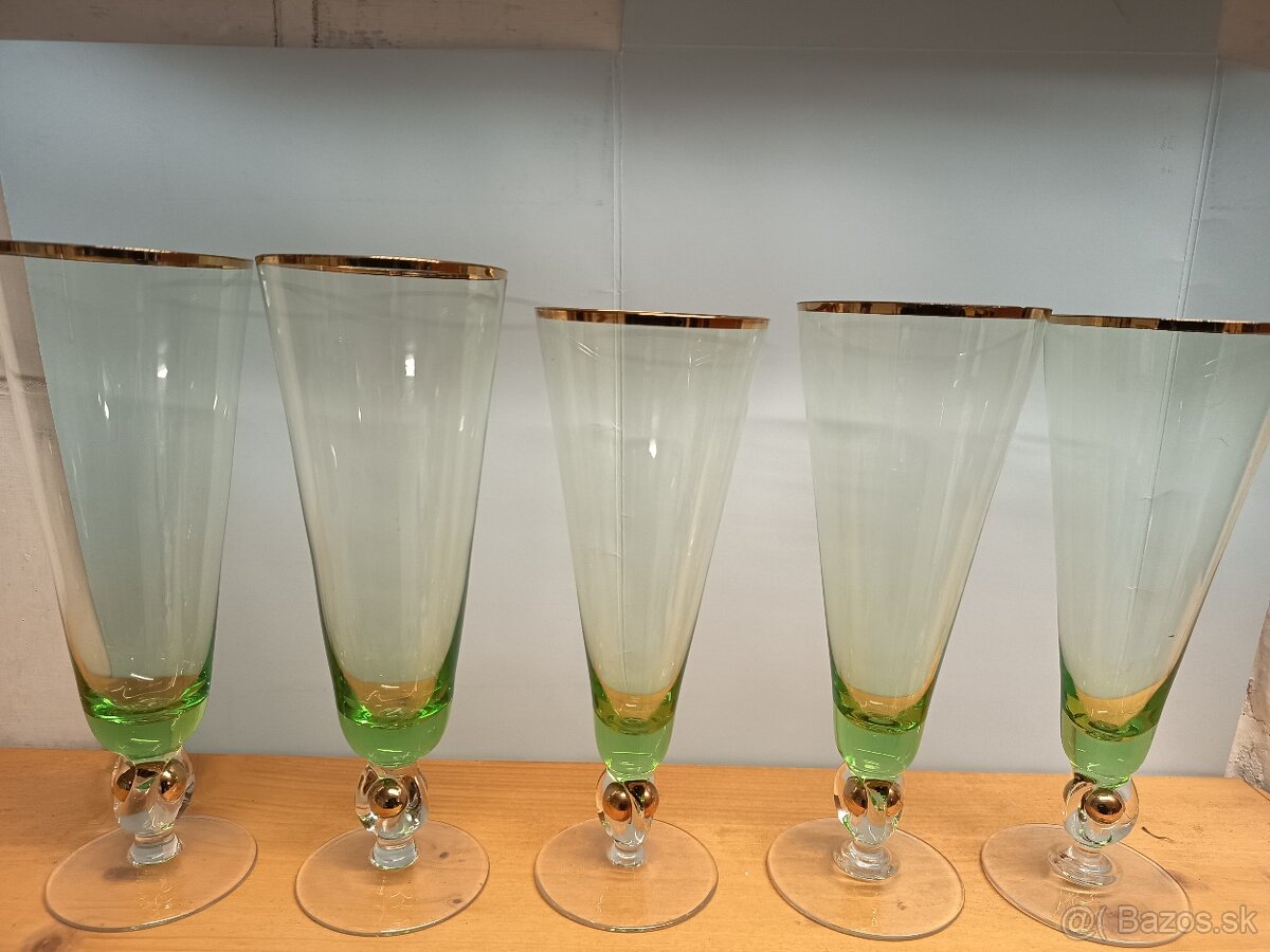 Predám retro sklenené poháre z kolekcie Zlatá Zuzana zo sklárne Zlatno. Známy dizajn Jozefa Staníka z obdobia ČSSR. Poháre majú typický zlatý okraj, zelený spodok a ozdobnú stopku s tromi zlatými guľôčkami.