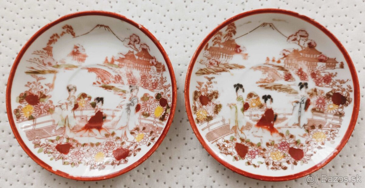 Ponúkam štyri tanieriky, japonský ručne maľovaný porcelán cca rok 1940, priemer 13cm. Cena za kus 6 eur.