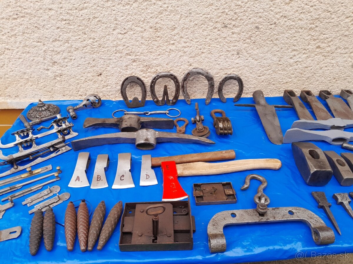 Kladivo,sekera,krompáč-čakan,motyka,podkova,zubadlo,nákovka-babka,zápustka,kladka,kľučka,závažie na kukučkové hodiny,nábytková haspra,korčule-kvinťáky,zámok na truhlicu.Stav dľa foto.NEDOSTUPNÉ 1000g KLADIVO,DRUHÁ PODKOVA Z ĽAVA,KĽUČKA A LIAT.STROPNICA NA ĽAVO,BABKA NA KOSU NA PRVÁ NA ĽAVO A PRAVO.