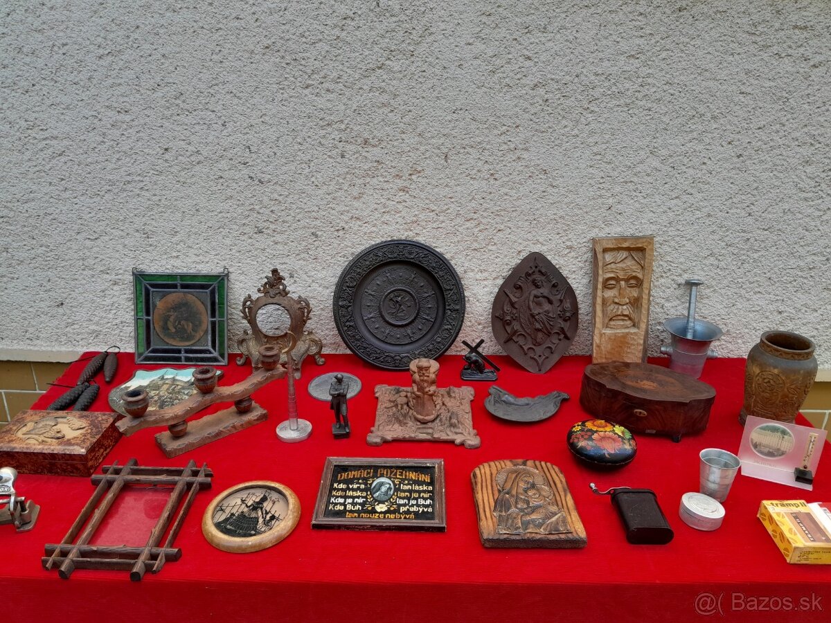 Liatinový tanier,liatinový skelet hodín,plastika,stojan na vianočný stromček,sklenená vitráž,drevená plastika muža,vyrezávaná váza lipové drevo, svietnik,rám na fotku,intarzovaná krabička,domáce požehnanie,plastika Bojnice,liatinový dierovač Fox,mlynček na kávu Tramp,Tramp II,turistický skladací pohár,teplomer Jáchymov.Stav dľa foto.NEDOSTUPNÉ DOMÁCE POŽEHNANIE,BAKELITOVÝ MLYNČEK TRAMP.