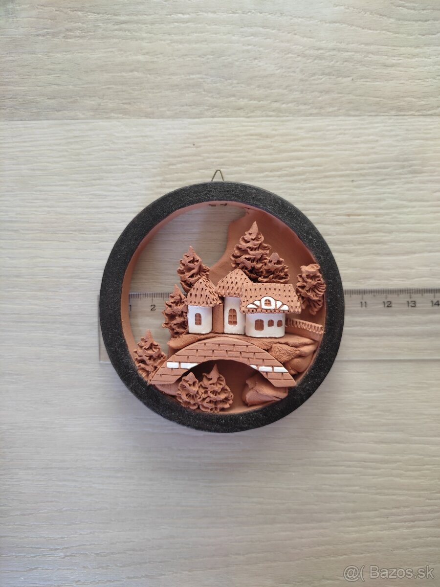 Predám keramickú dekoráciu na stenu s motívom domčekov na moste.