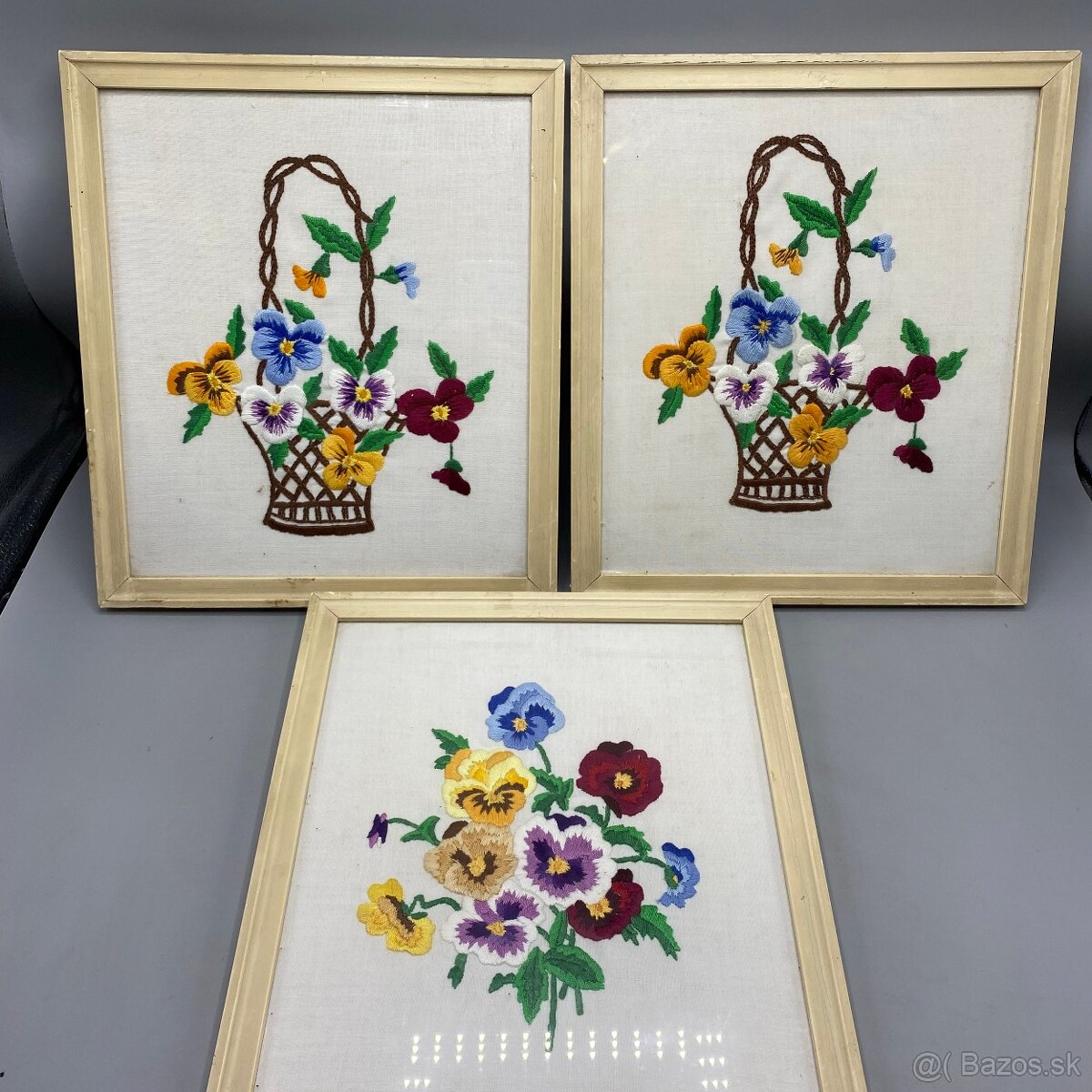 Ponúkam na predaj vyšívané obrazy. Vonkajšie rozmery sú 32x28 cm a vnútorné 28x24 cm. Stav - viď foto. Cena je 8,90€ za kus + poštovné. Zostal iba jeden obraz kvetov v košíku.