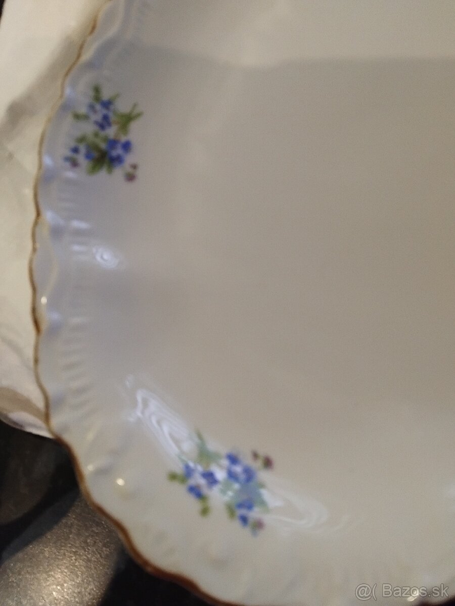 Predám retro obedovú súpravu značky Thun Czechoslovakia. 1x oválny servir. + 1 veľký okrúhly servírovací tanier, 1x obedová misa, 1x omáčnik, 5x plytký tanier. K tomu darujem veľký plytký tanier, priemer 30 cm.