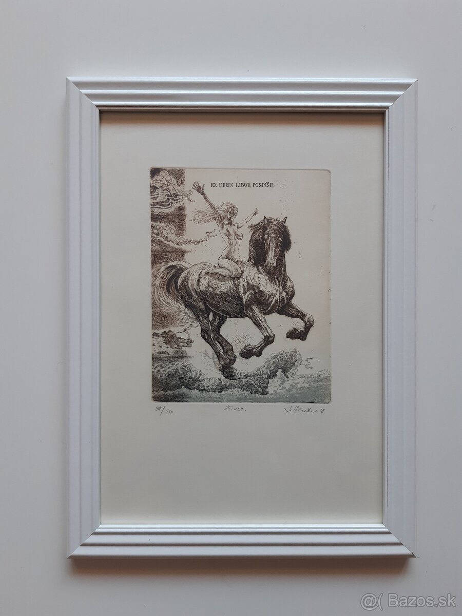 Ex libris Libor Pospíšil, 16 x 13 cm, signované ceruzkou "I.Piačka 18", rám, sklo (rozmer rámu cca 34 × 25 cm).