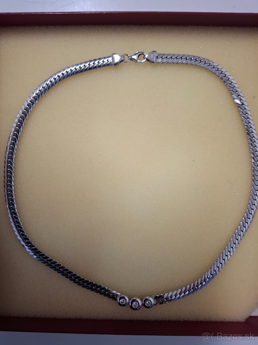 Predám krásny briliantový nahrdelník z bieleho zlata 585, v ktorom sú osadené 3 giamanty. Váha 18,84g. Samozrejmosťou je certifikát pravosti !!! Superrr cena, nakoĺko zlato a drahe kamene stále stúpajú na cene.