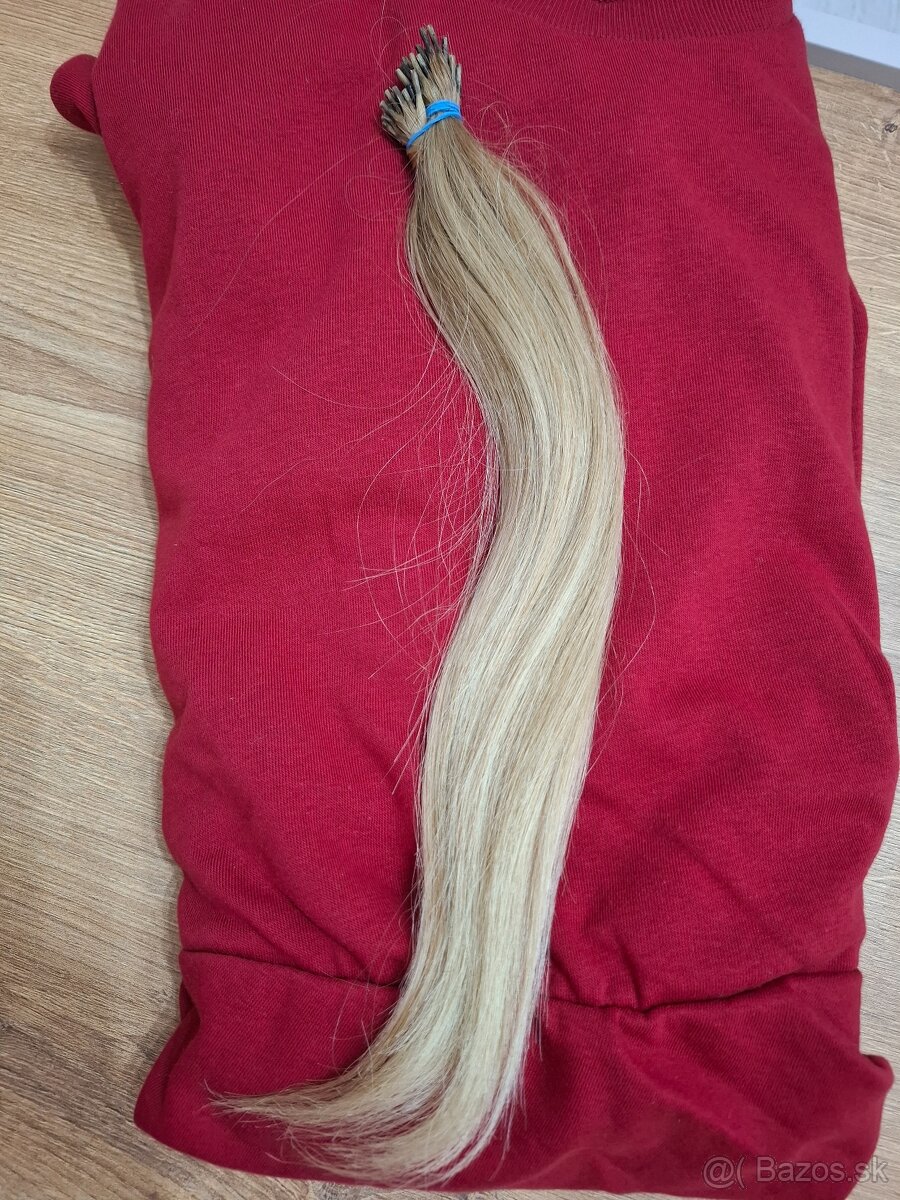 Predám nakeratinovane blond vlasy pripravene na predlzenie alebo zahustenie dlzka 30 až 35 cm. Raz nadpojene. Cena 40 eur + poštovné.