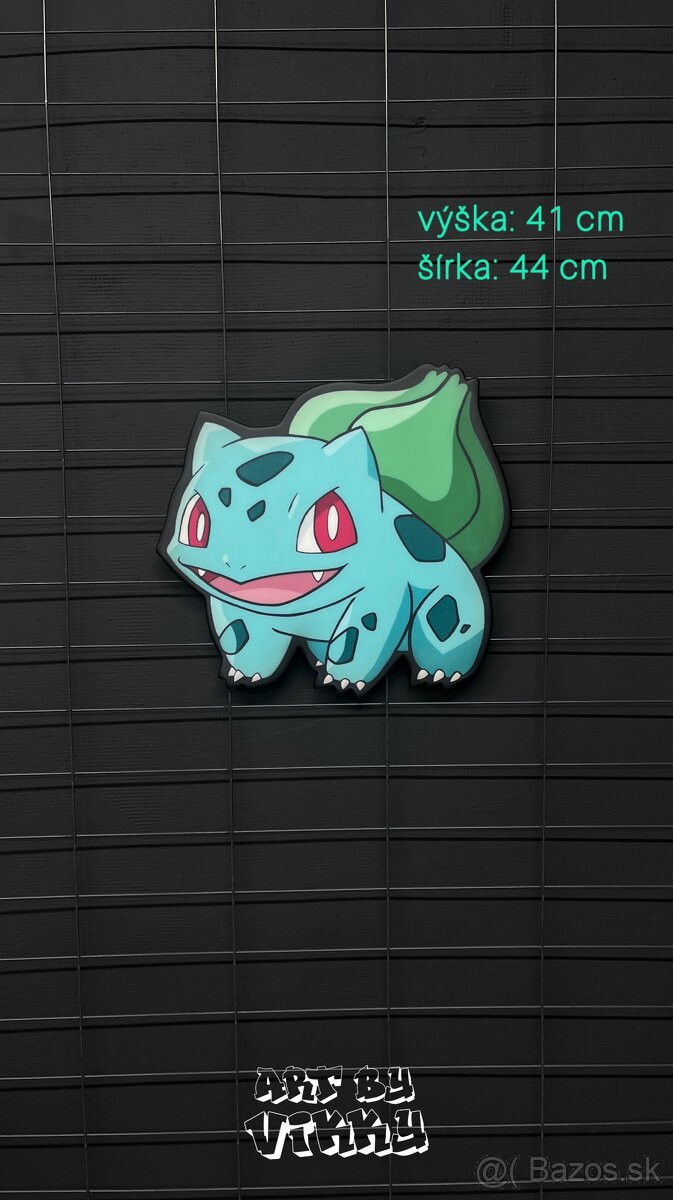 Predám nástennú dekoráciu z dreva v tvare postavičky Pokémon Bulbasaur. Ručne malované akrylom s matným finishom.