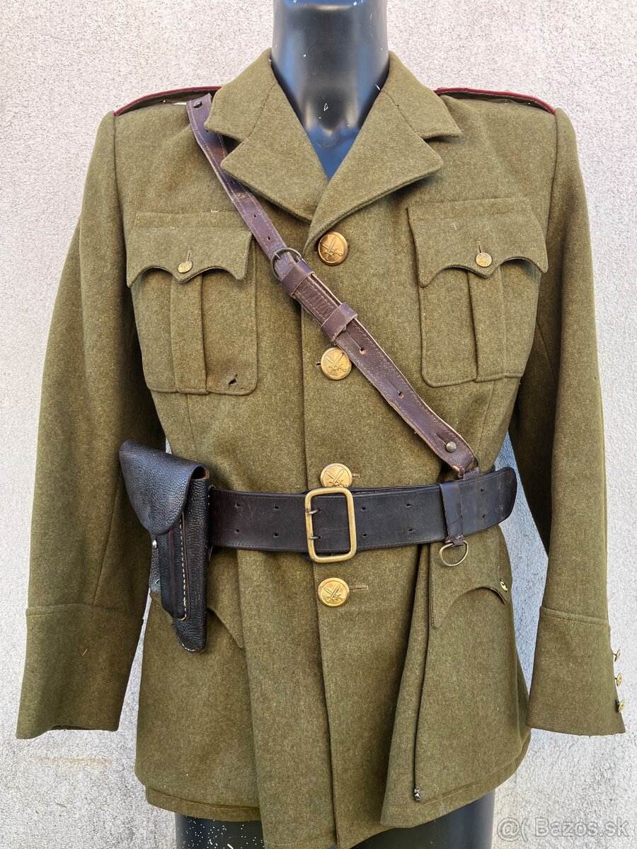 Predám vojenskú uniformu poručíka pechoty vz1945 používanú československou armádou v období 1945-1948. Kožená výstroj je len ilustračná a nie je predmetom predaja.