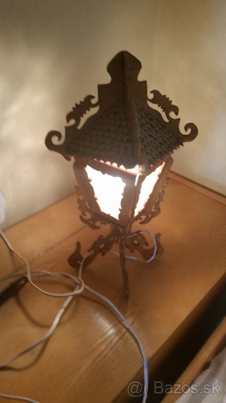 predám svietidlo na stolík, strieška sú lupene zo šišiek, doposiaľ použ. ako lampa, elektrina namontovaná amatérom, svieti, ručne vyrezávané drevo, roky cca 1970, využitie na chate,chalupe, okolie LC,PT, volať nie sms