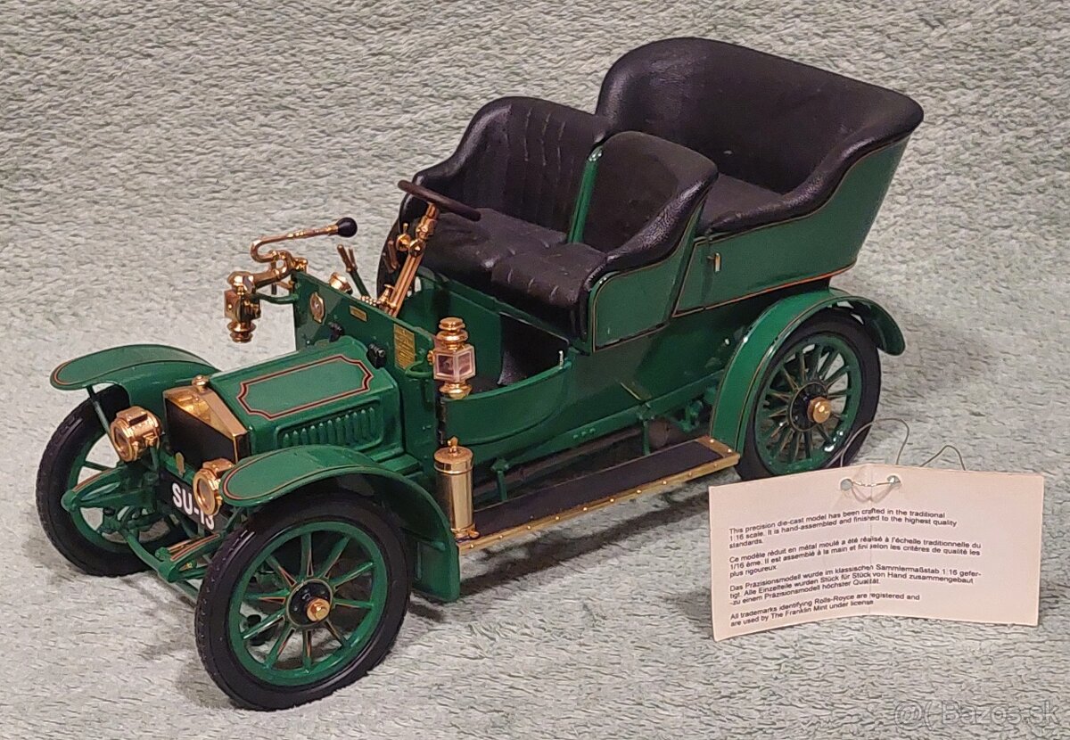 Pradám raritný model Rolls Royce 1905 od výrobcu Franklin Mint v netradičnej mierke 1:16. Model je detailne prepracovaný, ako je od značky Franklin Mint samozrejmosťou. Pohyblivé časti: volant - otáčanie prednej nápravy, výklopný kryt motora, otváranie dverí a vyklápanie sedadla splujajdca. Rozmery modelu sú: dlžka 210 mm, výška 102 mm, šírka 92 mm. Model bez poškodenia v top stave. Kompletné balenie.