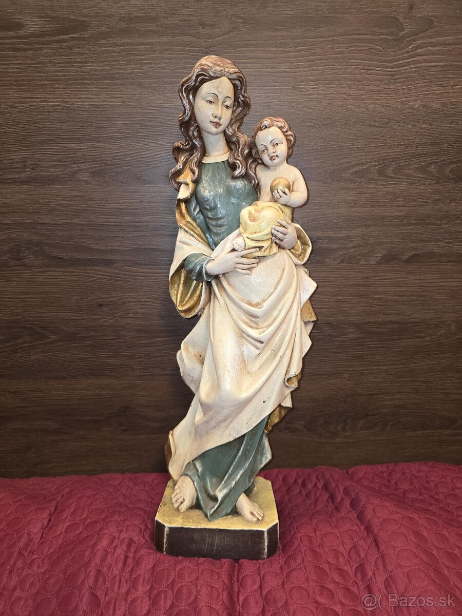 Drevená 58 cm vysoká maľovaná a zlátená (polychrómia) socha Madony s Ježišom v náručí.