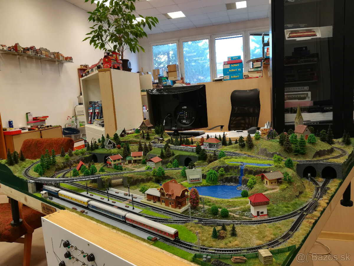 Hotové kolejiště N 120 x 100 cm.!PRODÁNO! (Můžete mít podbné, v případě zájmu volejte níže uvedený telefon, nebo pište na mail) Kolejiště je dvouokruhové, postaveno pro digitální provoz souprav ( jde přepojit na analogový) a analogové ovládání příslušenství. Okruhy jsou vzájemně propojeny. kolejiště je obsluhováno z ovládacího pultu, který obsahuje ovládání elektromagnetických výhybek, světelných návěstidel s vazbou do kolejí, odstavných úseků trati a tří světlených okruhů nočního osvětlení ( domečky, nádraží, zastávka).V trase kolejiště je jeden přejezd s blikači, ovládaný automaticky průjezdem vlakové soupravy. Součástí ceny nejsou napájecí trafa a vyobrazená vlaková souprava. Vše je možno dokoupit.