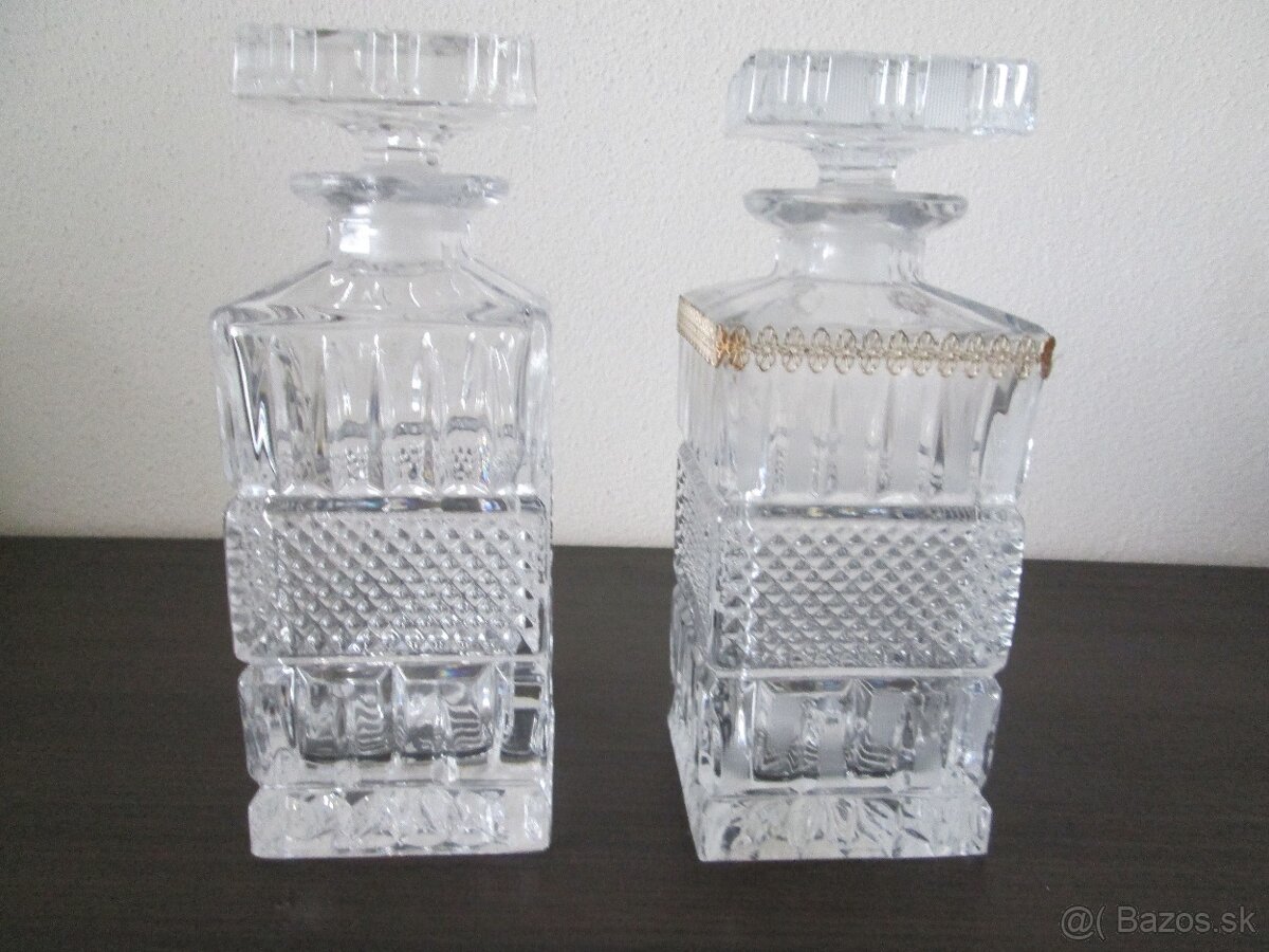 Predám nepoškodené brúsené , nepoužité karafy na whisky, výška 22 cm, šírka 9 cm, veľkosť vrchnáku 7x7 cm. ks 23.-eur.