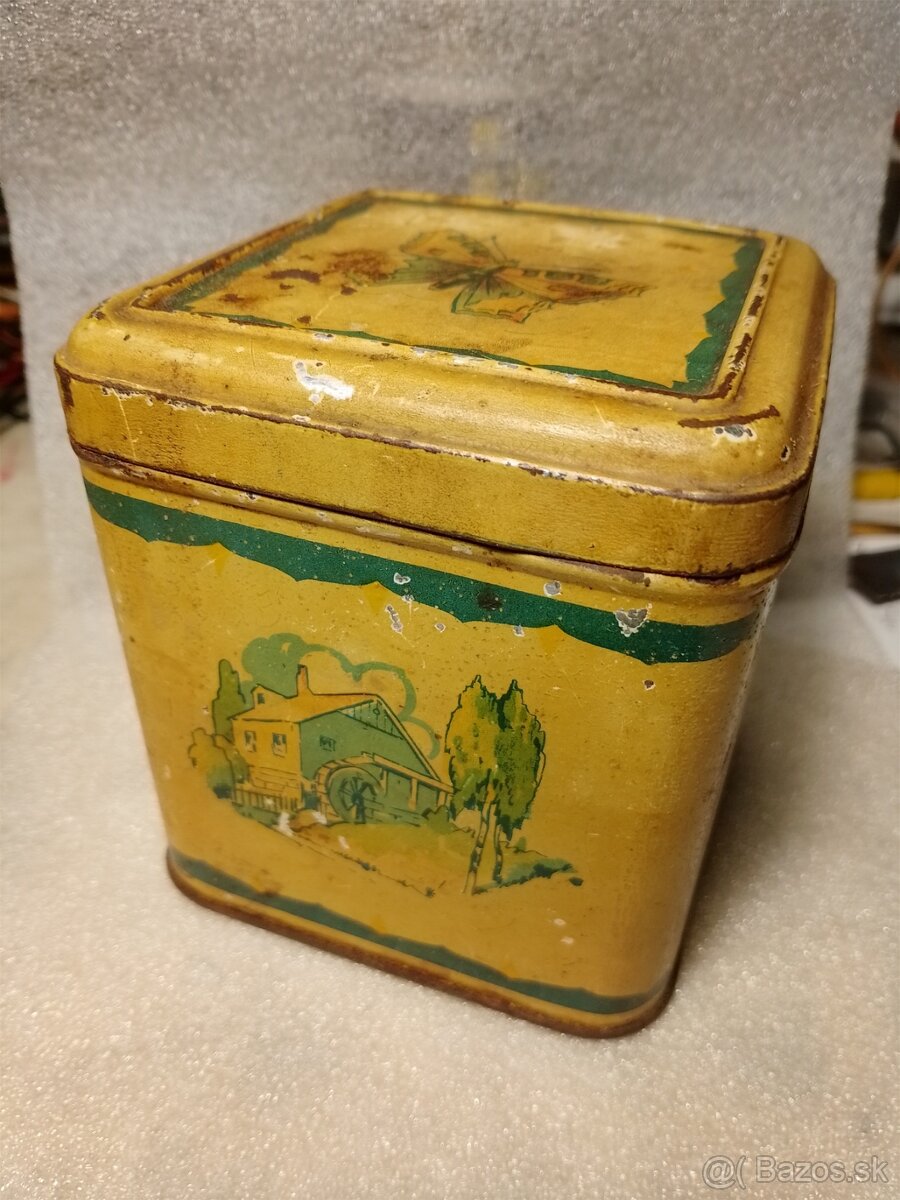 Plechová dóza z rokov cca 1940 až 1950 na cukrovinky, kávu,čaj.10x10x10 cm.+ ďalšie 3.Cena za všetko spolu.