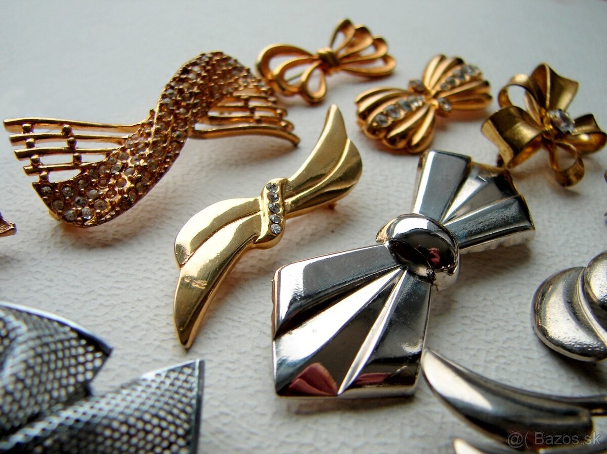 Starožitné a retro brošne - mašle. Bižutérny kov, niektoré štrasy, perličky, email, balotina. Rozmery - mierka brošňa č.20: 3,7 x2 ,5cm. Ceny: 12-22eur - podrobný rozpis cien, číslovanie a viac fotiek na foto v komentári.