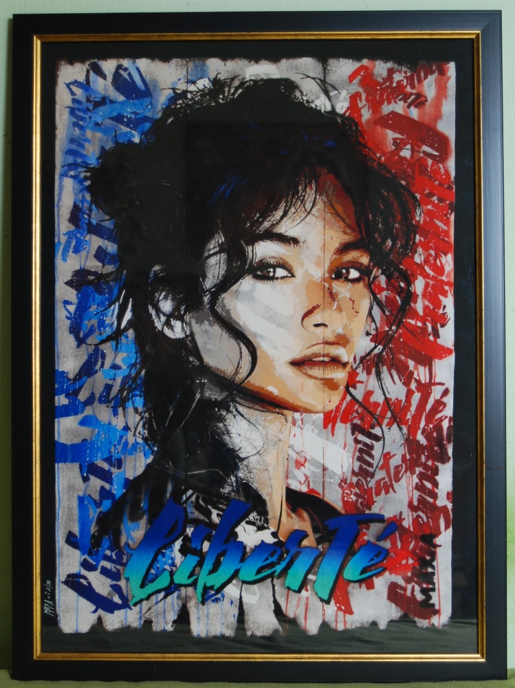 Táto umelecká tlač s názvom „Liberté“ je dielom Maxa Andriota (1982), súčasného autora známeho svojím charakteristickým prepojením figurálnej kresby, street artu a grafickej expresie. Dielo pôsobí ako vizuálny manifest slobody, individuality a modernej identity, ktoré sú ústrednými témami Andriotovej tvorby. Obraz je vo výbornom stave, s novým rámom.