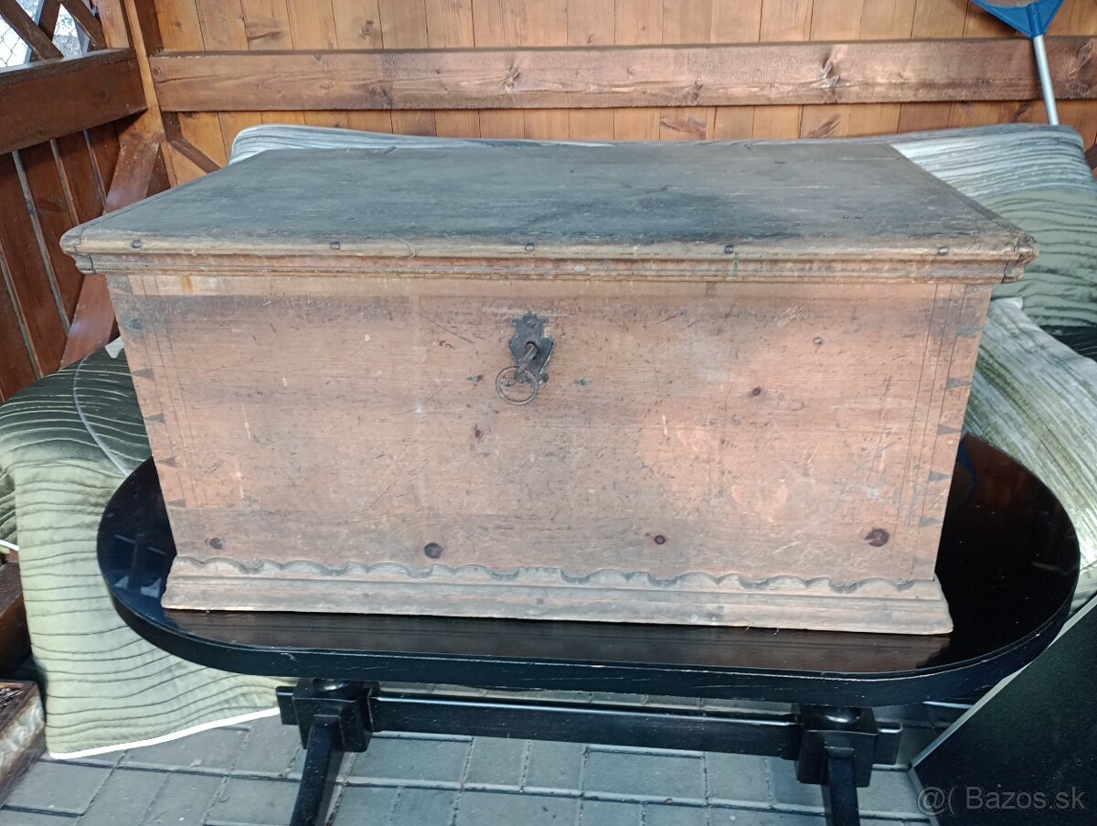 Rozmery 90x40x50. Starožitnost s funkčným kľúčom a zámkom.
