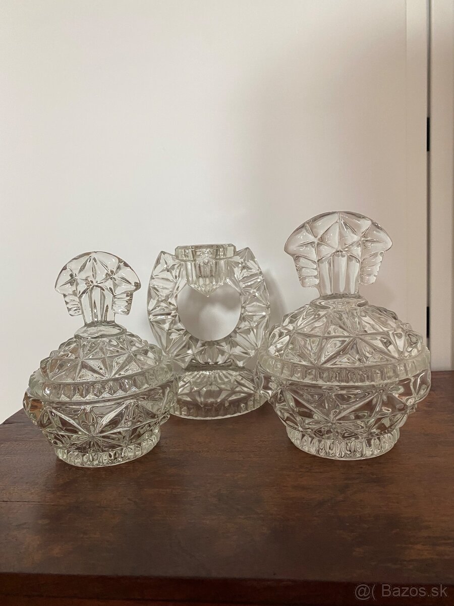 Sklenene dozy a svietniky - [10.3. 2026]Na predaj rozne dozy / cukornicky a svietniky. Stare ceskoslovenske sklo. Ceny od 10€ . Vysoka doza s vrchnakom vyska 25cm cena 22€. V pripade zaujimu poslem dalsie foto a info.