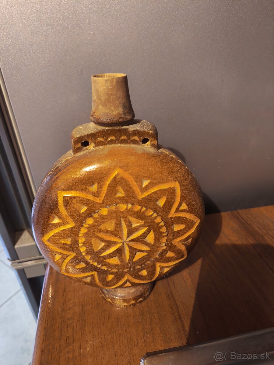 Predám dekoratívnu drevenú čutoru (poľnú fľašu) s bohatým ručne vyrezávaným zdobením. Ide o poctivú remeselnú prácu s tradičným solárnym/hviezdicovým motívom, vhodnú ako štýlový doplnok na chatu, do štýlovej kuchyne alebo pre zberateľa ľudového umenia.