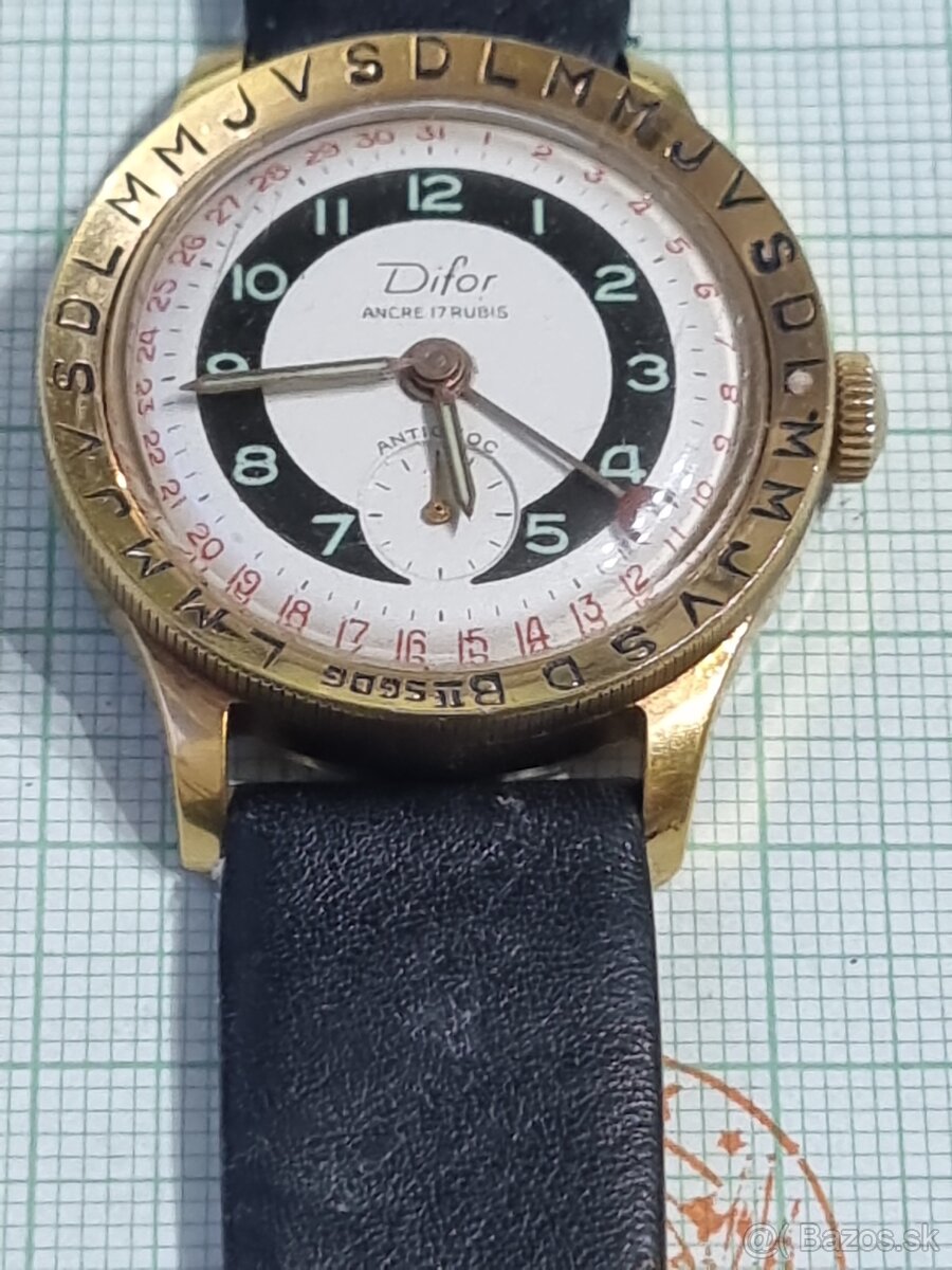 Pozlátené náramkové hodinky,Difor ancre 17 rubis,antichoc,otáčacia luneta,priemer púzdra 34mm,nový kožený remienok,šroubovacie zadné viečko,dvojfarebný ciferník,dátum je po obvode ciferníka,všetko funguje spoľahlivo.Hodinky sú zo 60-tych rokov,a idú presne.Cena+pošta,nezjednávam.