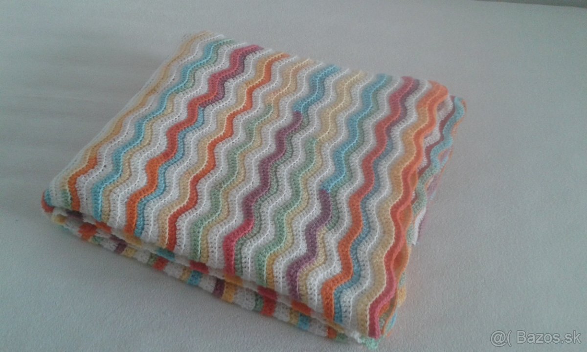 háčkovaná, rozmer 1,90-2m x 1,45-1,50m, podobné pletenine, pružné, ako jedna dospelácka deka, alebo aj ako prehoz na dvojmetrovú posteľ, prispôsobí sa