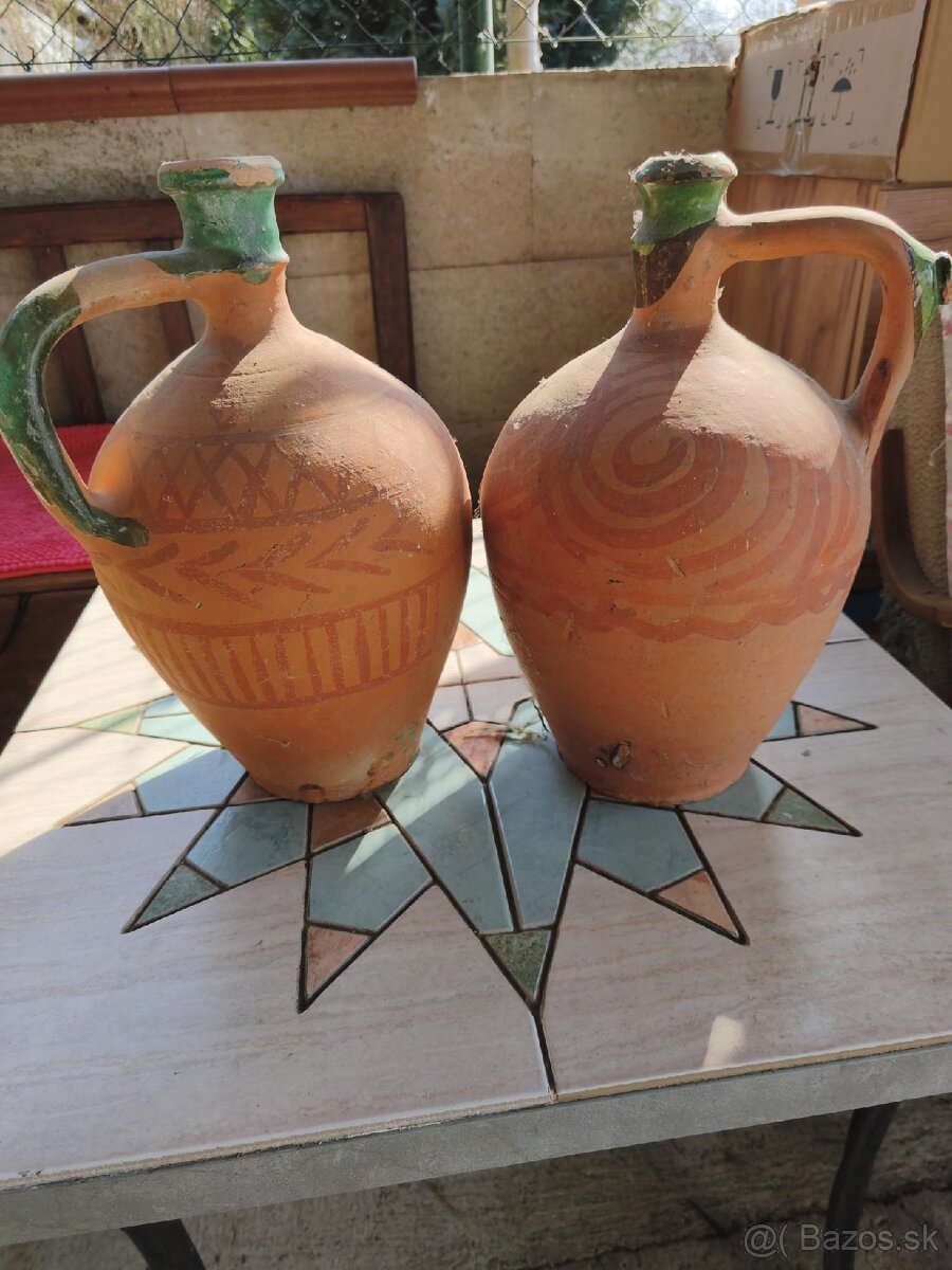 Ponúkam na predaj vzácnu starožitnú nádobu na víno a iné tekutiny, známu ako čepák. Ide o autentický kus moravskej keramiky z obdobia vrcholného biedermeieru, vyrobený po roku 1850. Dva ks cena spolu + skôr osobný odber