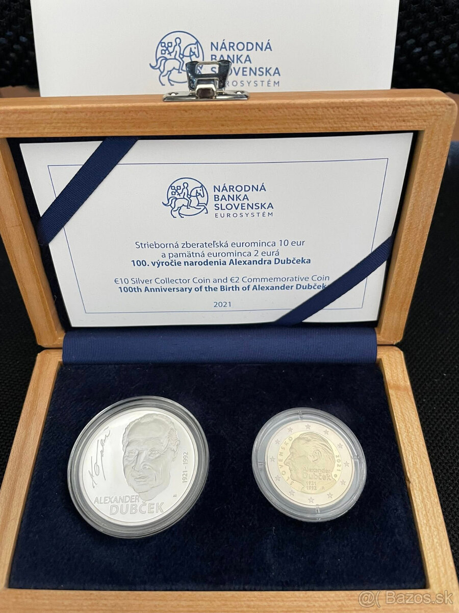 Ponúkam privátnu "dvojičku" 2€ a striebornú 10€ mincu v proof kvalite 2021 A.Dubček v drevenej kazete. Privátna emisia NBS.
