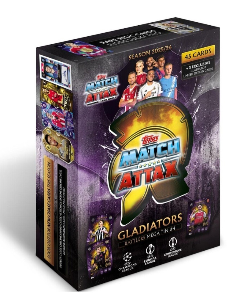 TOPPS 2025/2026 Topps Match Attax Mega Tin varianta 4 - [11.3. 2026]Plechovka obsahuje 45 bežných kariet a 3 karty z limitovanej edície.