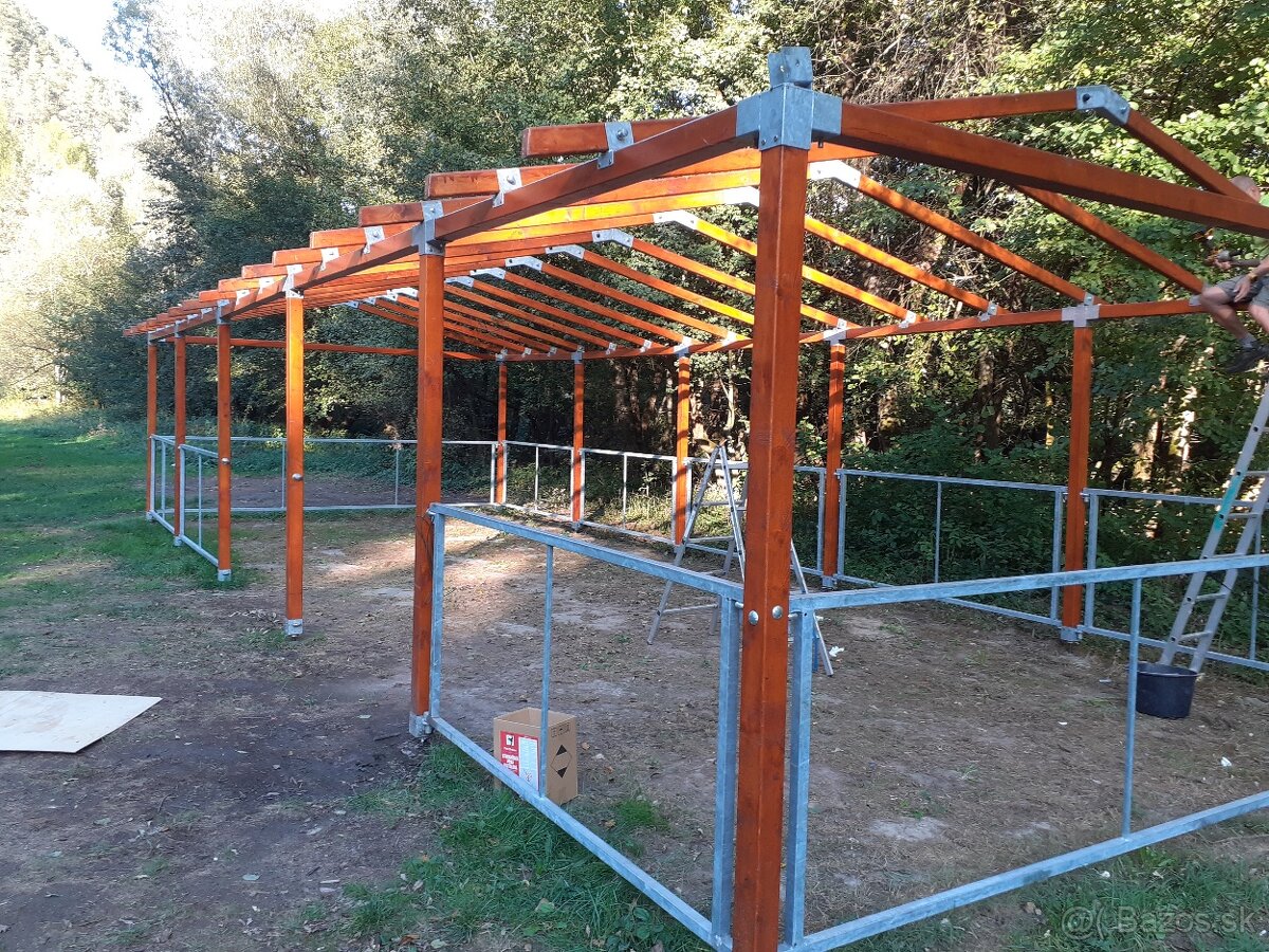 Predám drevený rozoberateĺný altánok o rozmerov 5x12,5 metra. Altanok je vyrobený z KVH hranolov 10x10cm. Strešné KVH hranoly 10x5cm. Bočné diely sú vyrobené z jakla 40x40mm. Všetky kovové komponenty sú žiarovo zinkované. Altánok má aj výškovo nastaviteĺné nohy kvôli prípadným nerovnostiam terénu a je dvakrát natretý lazúrovacím lakom Chemolux. Altánok je možné skladať aj po sekciach 2,5 m. Altánok sa predáva bez strešnej plachty.