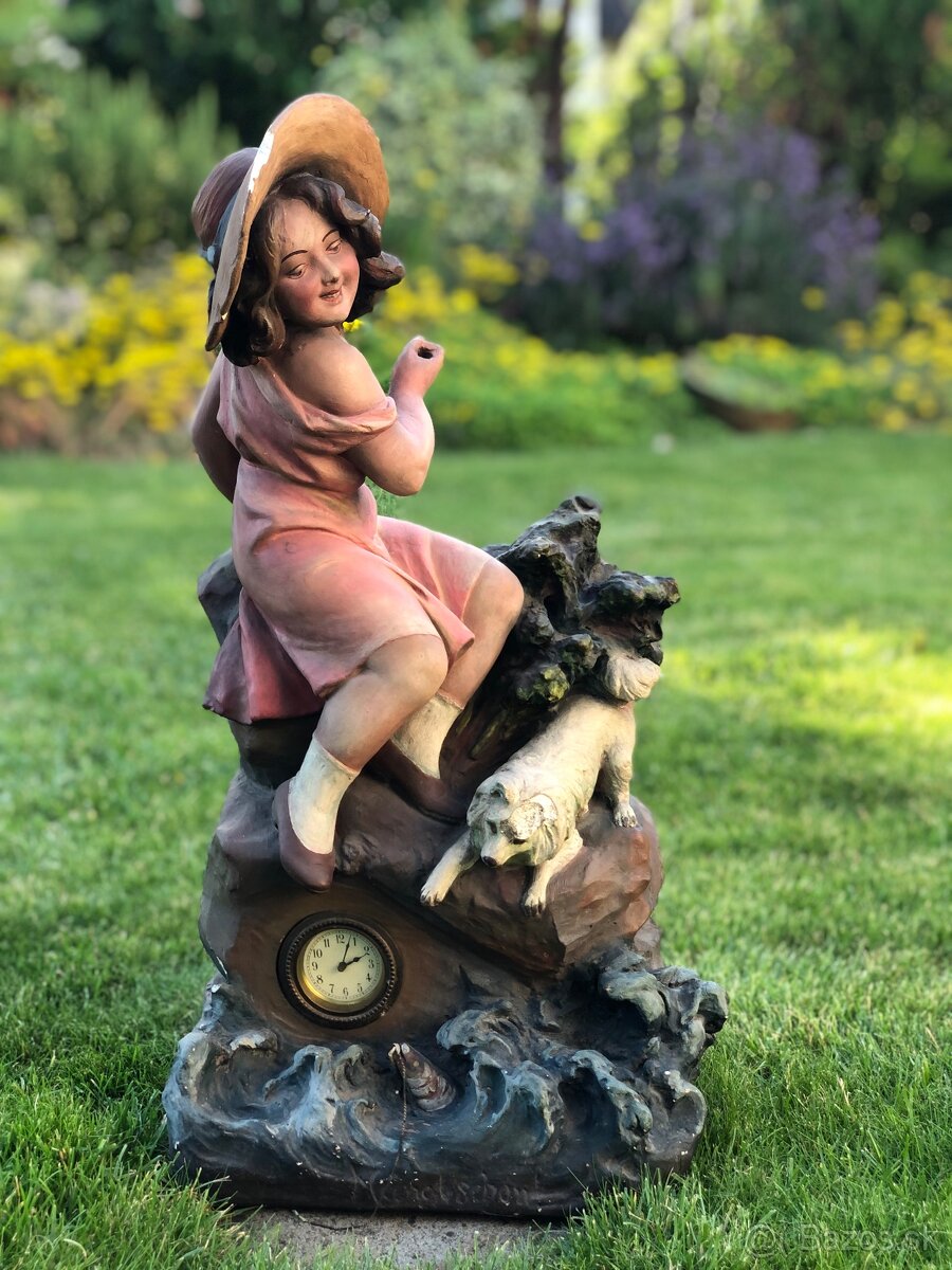 Predam starucku velku sochu Dievca na rybacke. Nalezovy stav. Hodinky nie su funkcne. Material sadra. Signovana. Vyska 60 cm.
