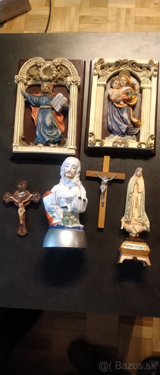 kríže, 3D ikony, sošky (p.Mária, svietiaci Kristus).