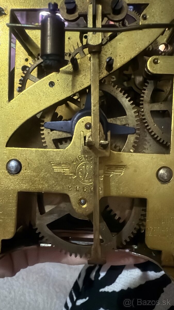 Zobrazený predmet je mosadzný hodinový strojček, pravdepodobne od značky Kienzle.
