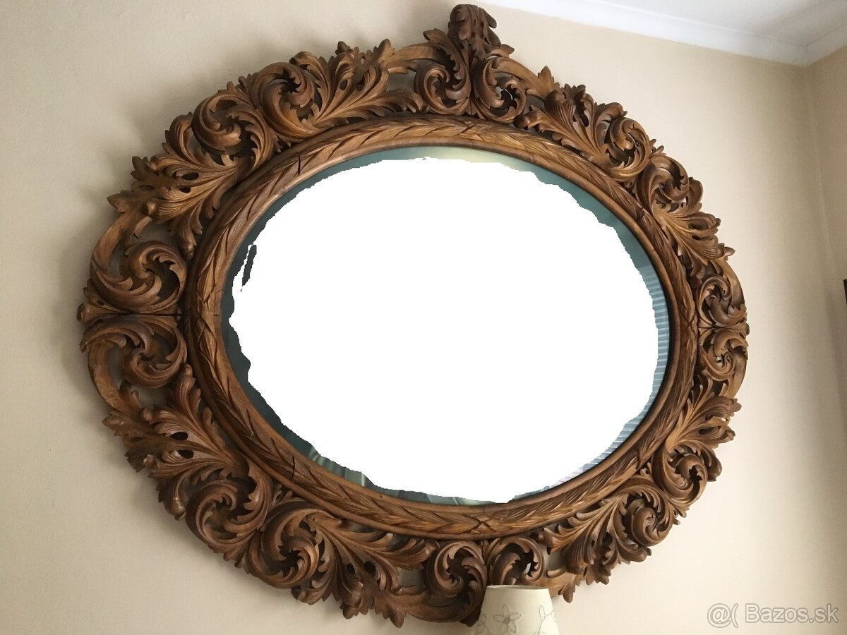Veľké vyrezávané zrkadlo z orechového dreva - [17.1. 2026]Krásne veľké zrkadlo z orechového dreva. Za svoj šarm vďačí aj krásnym vyrezávaným motívom. Vo vyrezávanom ráme je osadené fazetové zrkadlo. Prirodzená štruktúra dreva a vosková povrchová úprava mu dodáva noblesu starožitnosti.