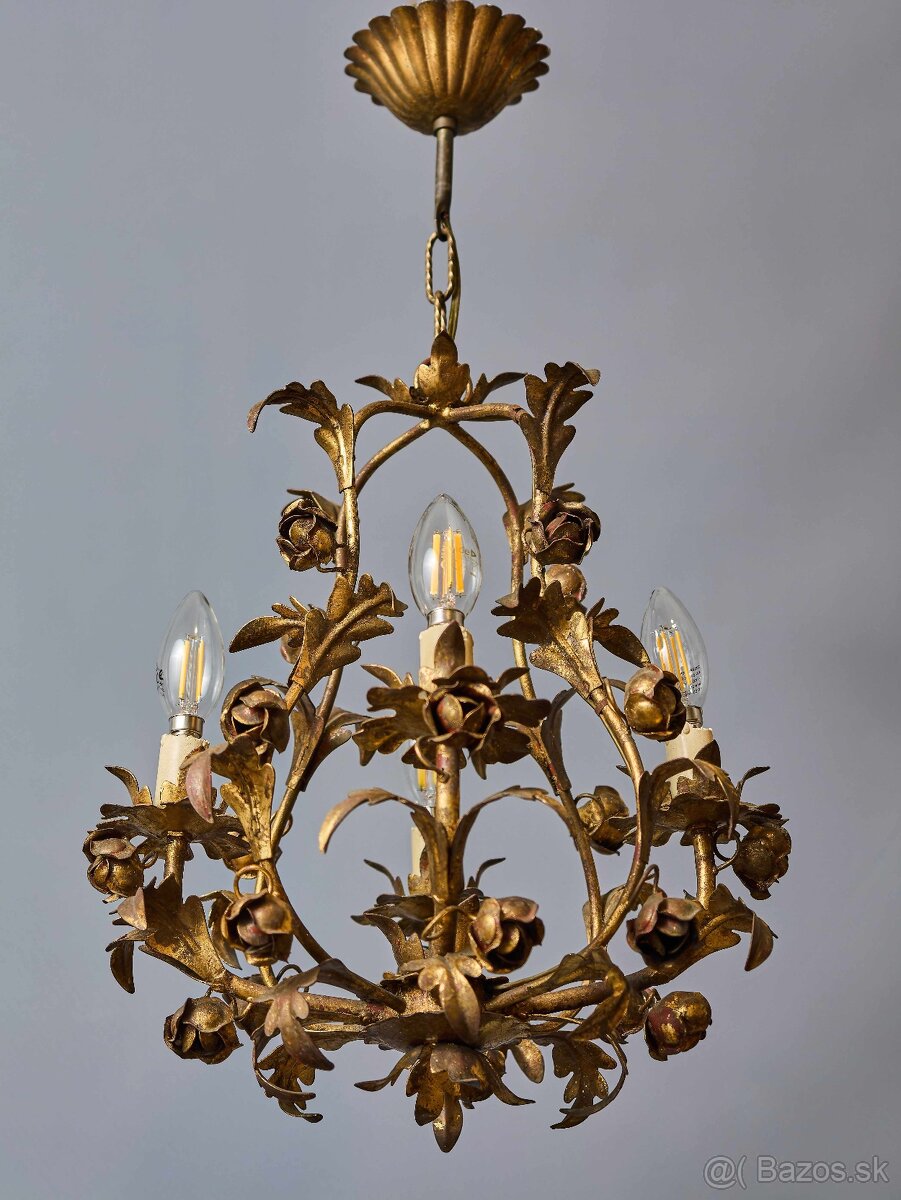 Menší štvorramenný luster z polychrómovaného plechu umelecky stvárnený ako zväzok listov s kvetmi. Luster je celý ručne maľovaný. Luster je ideálny do chodby alebo do zimnej záhrady. Skontrolovaná elektroinštalácia - ihneď na používanie. Žiarovky s klasickým sviečkovým závitom E14 do 60W (vhodné sú klasické, halogénové aj ľad žiarovky).