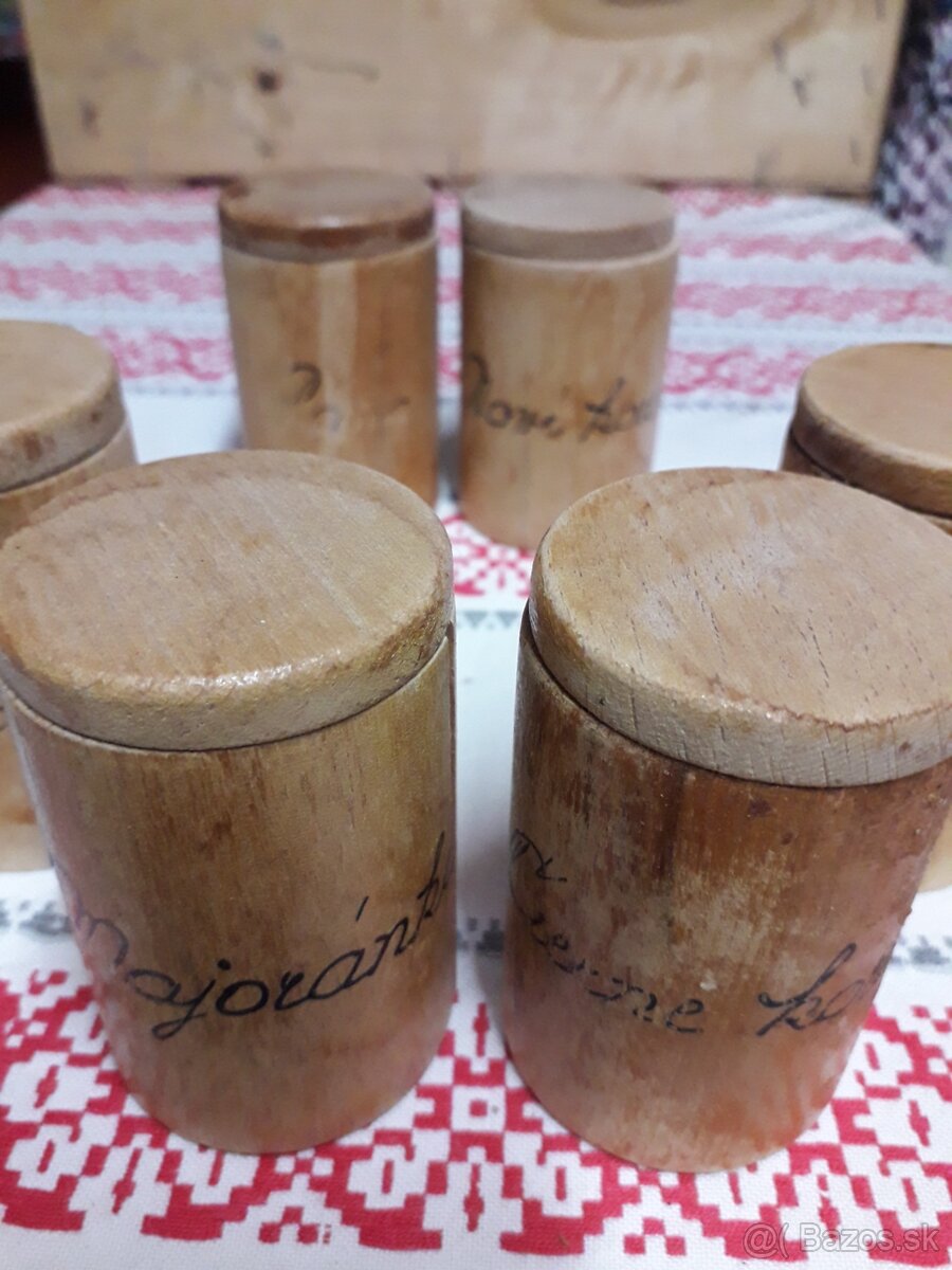 Predám staré drevené koreničky majoránka,čierne korenie, paprika,rasca,škorica,nové korenie v nalezovom stave vhodné na zrepasovanie.