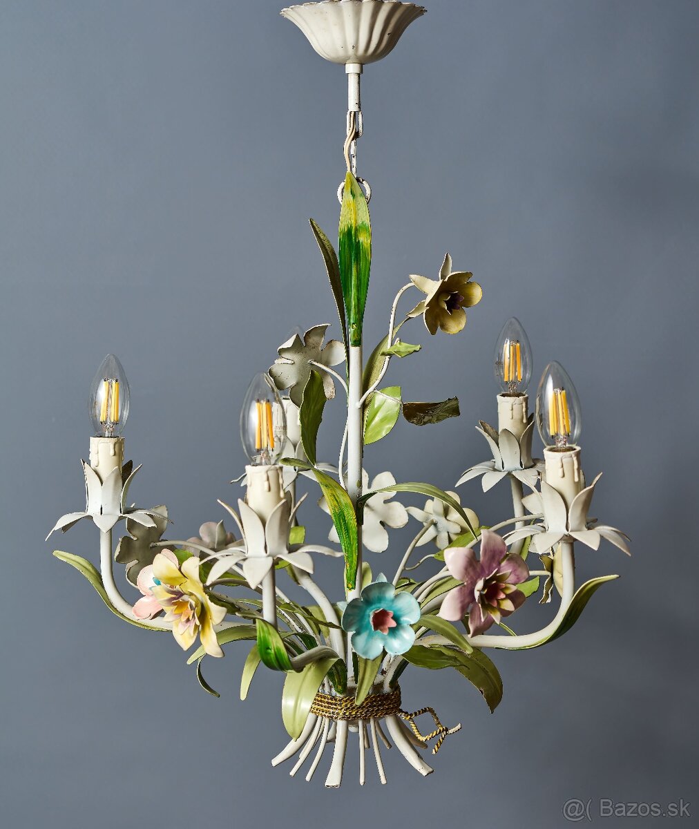 Menší päťramenný luster z polychrómovaného plechu umelecky stvárnený ako zväzok listov s kvetmi. Luster je celý ručne maľovaný. Luster je ideálny do chodby alebo do zimnej záhrady. Skontrolovaná elektroinštalácia - ihneď na používanie. Žiarovky s klasickým sviečkovým závitom E14 do 60W (vhodné sú klasické, halogénové aj ľad žiarovky).